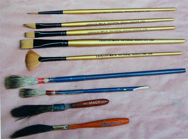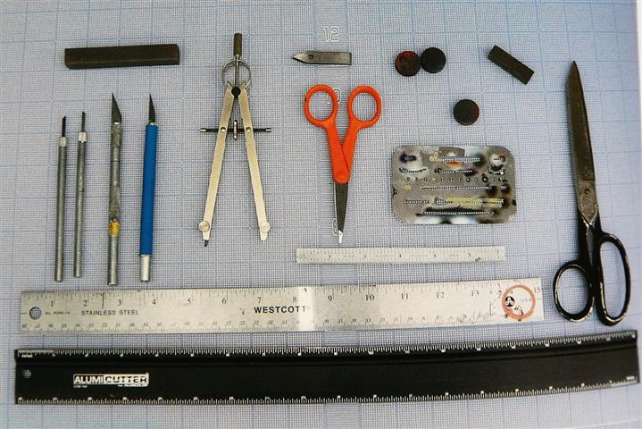 Plusieurs outils de découpe, des pinceaux de brosses differentes, du calque,