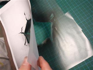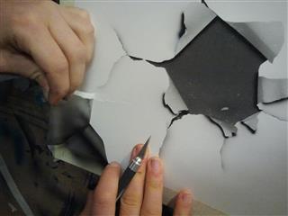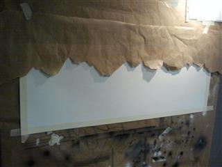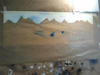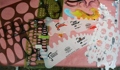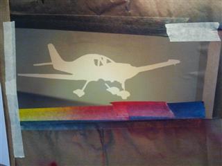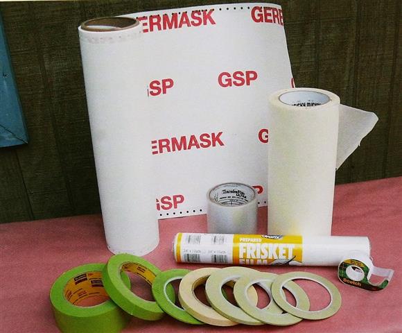 Le film de masquage, les scotchs de peintures et de carrosseries, du Sopalin, des pochoirs de tout types, que je me fabrique avec un cutter et du canson épais.