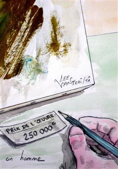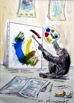 1ere image d'un tableau peint par un singe. La 2nde, le tableau est vendu par un galeriste puis exposé.