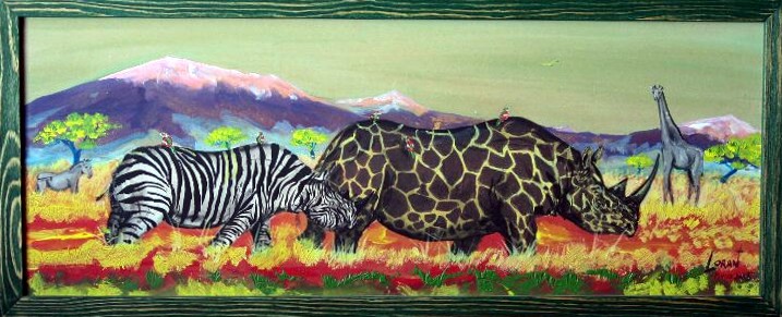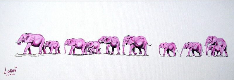 Tableau d'un troupeau d'éléphants roses sur toile,et inspiré du fait que durant 24h d'affilées,