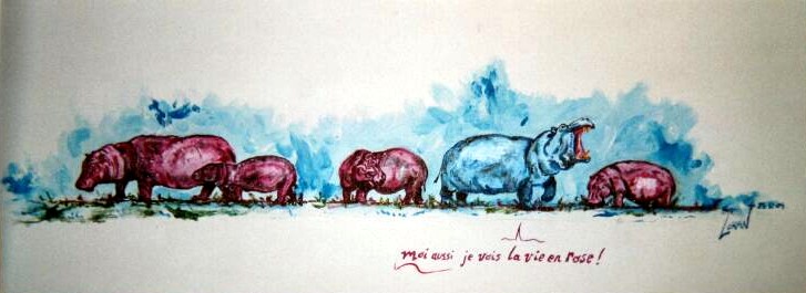 Tableau des Hippos Rigolos où celui qui est bleu crie son desepoir de voiloir voir la vie en rose !