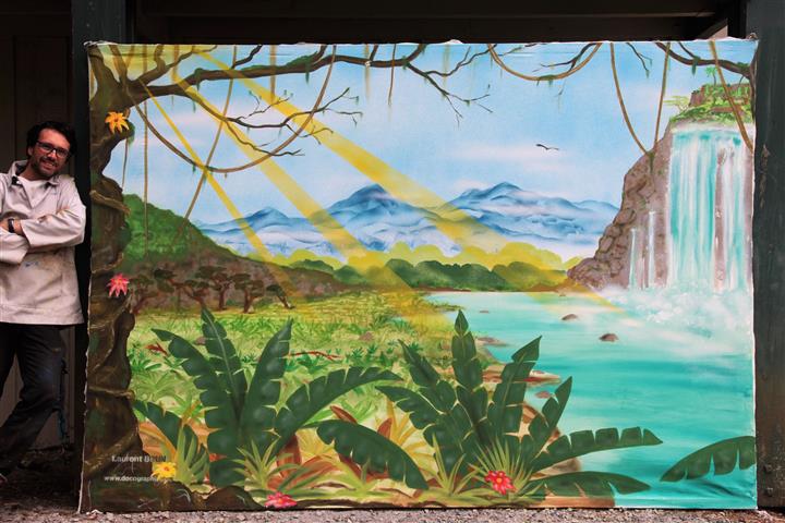 Beaucoup d'aérographe et du pinceau en partant des montagnes du fond pour arriver à l'arbre au premier plan.Ce panneau fait parti du spectacle du Roi Lion,