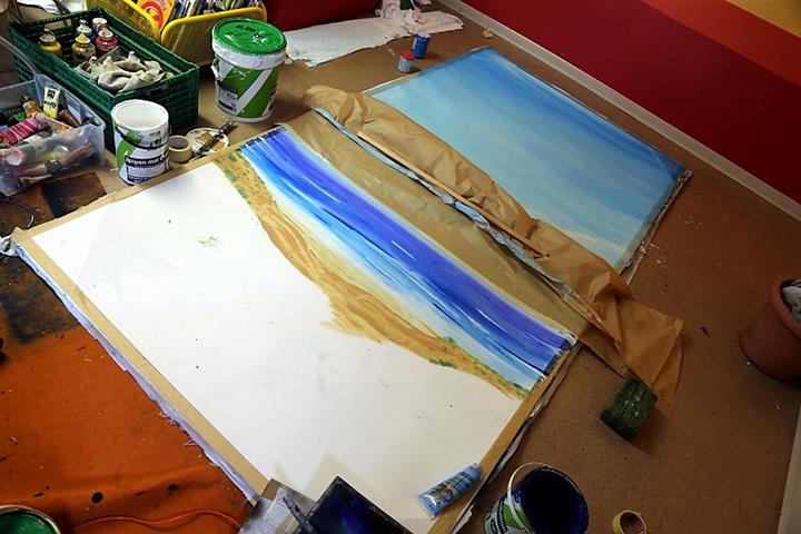 2 - peinture de l'océan et du sable à l'éponge puis la fôret au pinceau