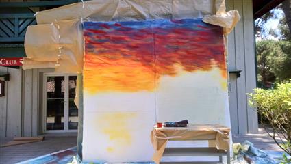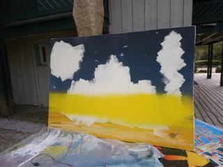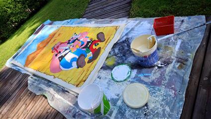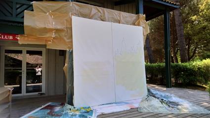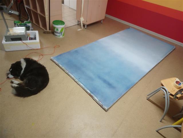 1 Seule journéé pour réaliser ce tableau géant entre aéographe et pinceaux et d'abord en intérieur avec le chien qui dort !