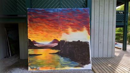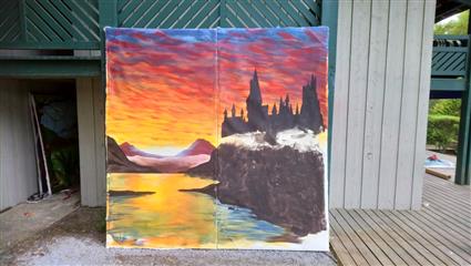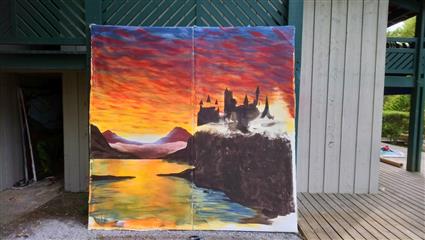 N°7: J'ai mis du Rouge et Vilolet dans le ciel, et je délave avec des reflets verts et orangés dans le lac. J'inère les collines de l'horizon et la base du chateau.