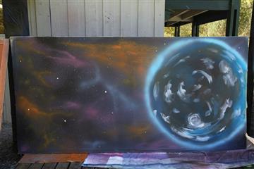 Les gardiens, l'espace,réaliser un nuage en fond de deux planètes....