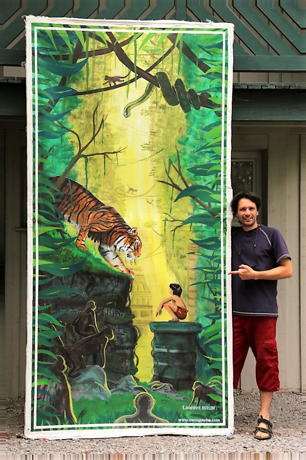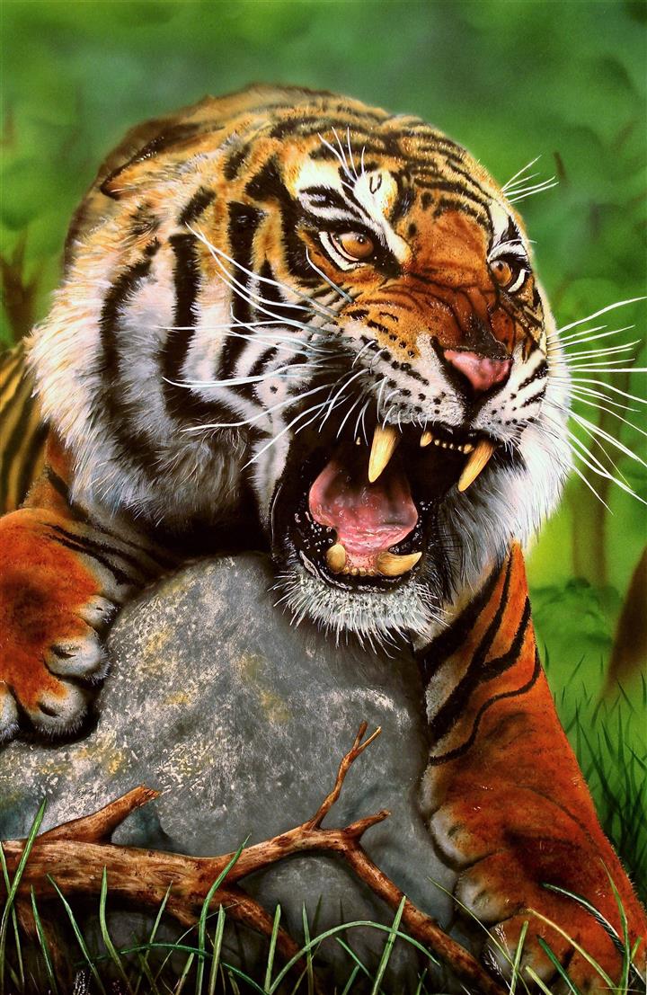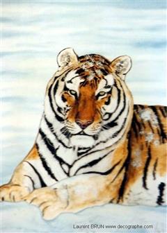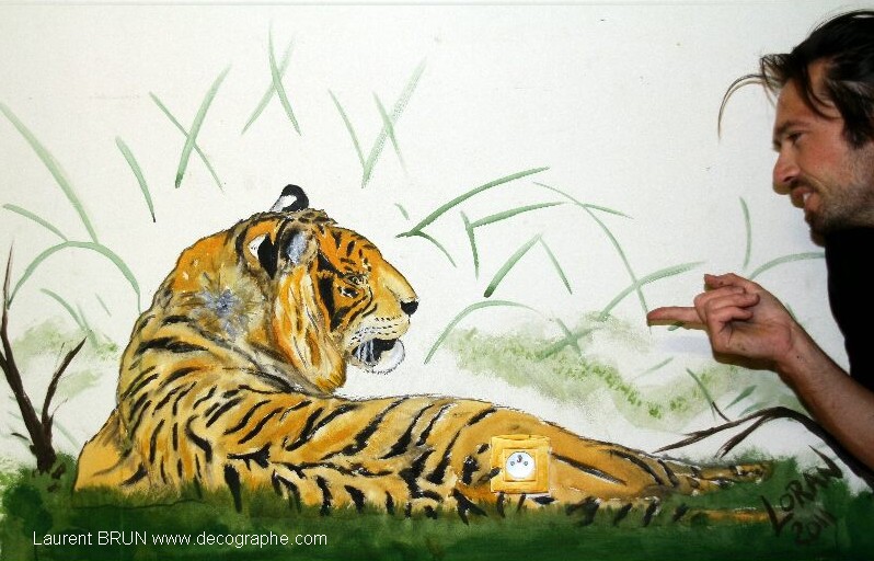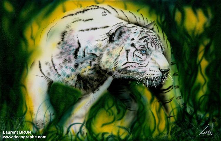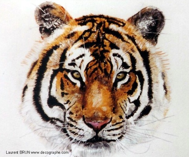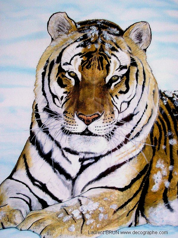 Le Tigre est dessiné sur le papier. En premier lieu, je masque les yeux, les dents et les moustaches à l'aide de scotchs. Puis je masque le tigre en entier pour pulvériser à l'aérographe le fond. Je crée des pochoirs d'arbres et de branches découpés sur mesure au scalpel. Je les applique à distance du support pour donner l'impression de flou. Puis je donne sa couleur au Tigre et à l'aide de pinceaux utilisés en pointillisme, je donne l'impression de fourrure. A d'autres endroits, les pinceaux brosse permettent les longs poils. Puis je m'occupe du regard. Ensuite la langue est peinte en entier dans la bouche. Je dégrade à l'aérographe avec du noir l'ombre dans la bouche. C'est qu'ensuite que je décolle les scotch qui protégeaient les dents ainsi toutes blanches. Je les peins, leur donne leur ombrage et les rayes dans leur longueur à l'aide de la gomme électrique. Je m'occupe de peindre le rocher et de le rayer avec du spontex et la gomme électrique. Je fini la gueule du Tigre et enfin je peaufine le décor. 4 jours de travail.