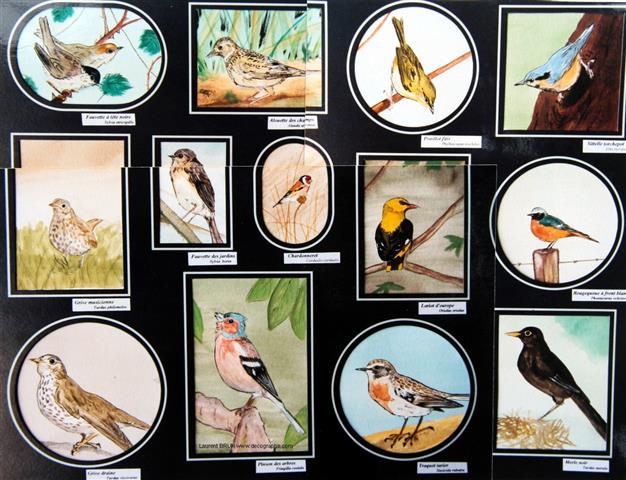 Fauvette à tête noire, Alouette des champs, Pouillot fitis, Sitelle torchepot, Grive musicienne, Fauvette des jardins, Chardonneret, Loriot d'Europe, Rouge queue à front blanc, Grive draine, Pinson des arbres, Traquet tarier,Merle noir